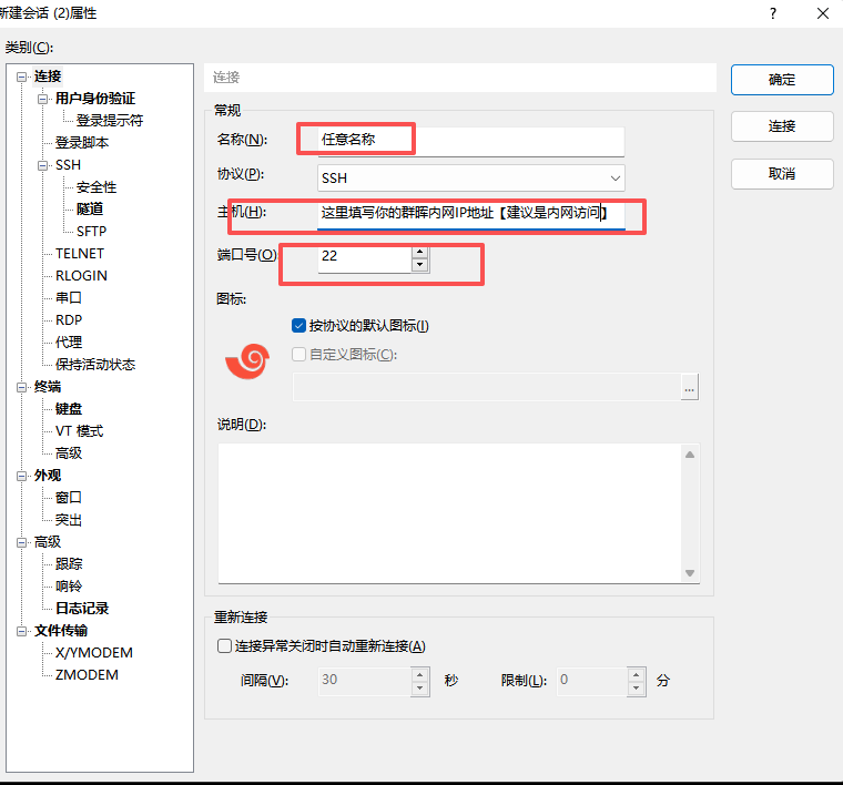 我这里使用的是Xshell8工具来连接黑裙的,新建会话连接,如图所示,注意连接的软件所用电脑网络建议和群晖在同一个内网中,不然涉及到端口映射比较麻烦,地址就填写群晖内网IP地址,端口就是第二步你设置的端口,默认22。