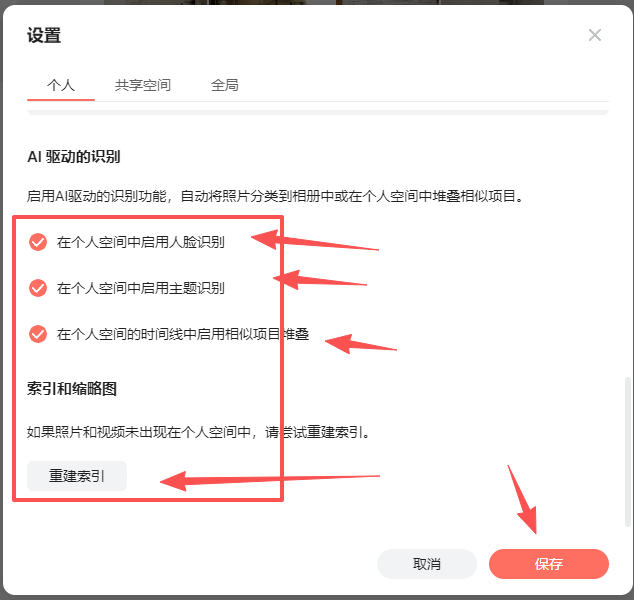 重新去群晖套件中心启用Synology Photos套件,然后打开Synology Photos后在右上角设置里面设置如下即可,等待索引完毕即可,时间和照片数量有关。